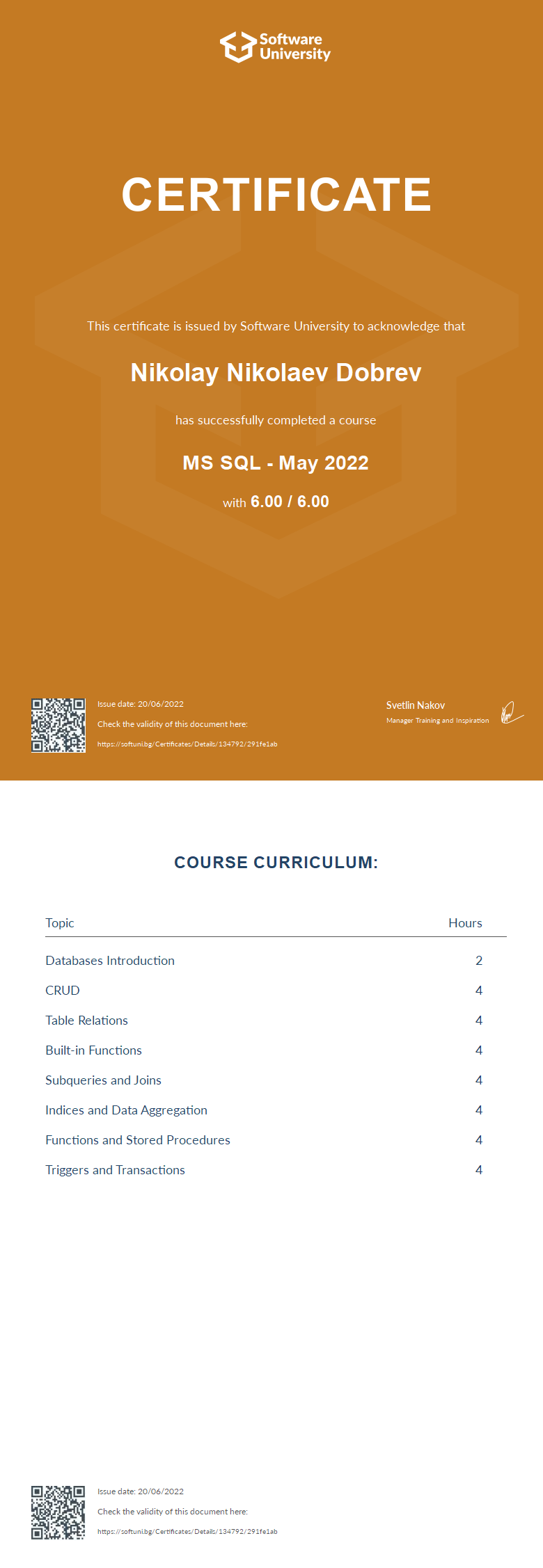 This certificate is issued by Software University to acknowledge that