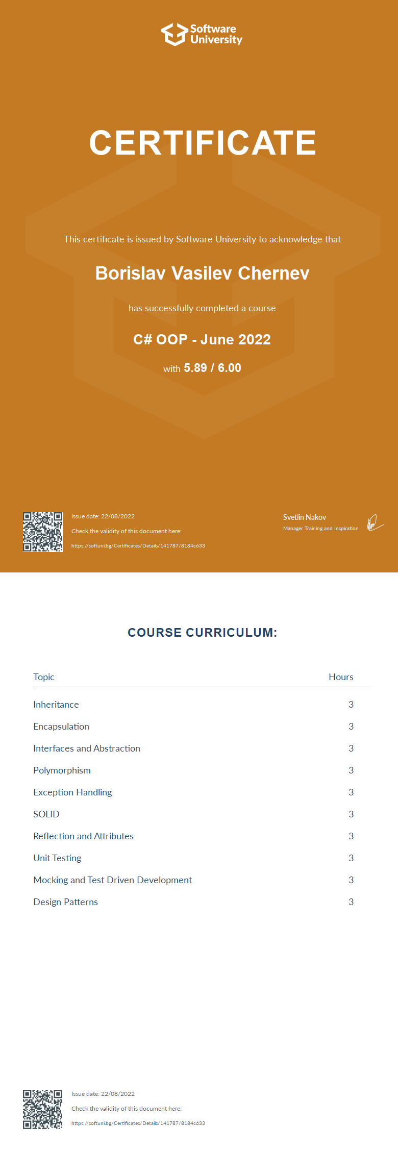 This certificate is issued by Software University to acknowledge that