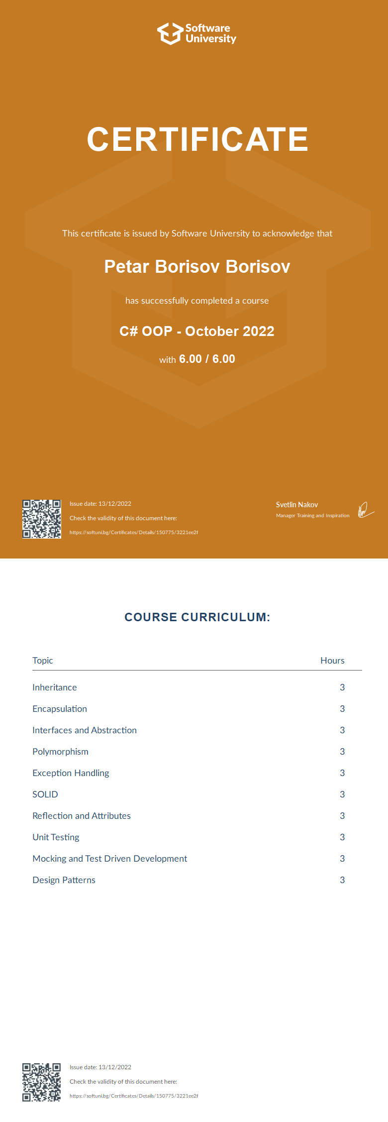 This certificate is issued by Software University to acknowledge that