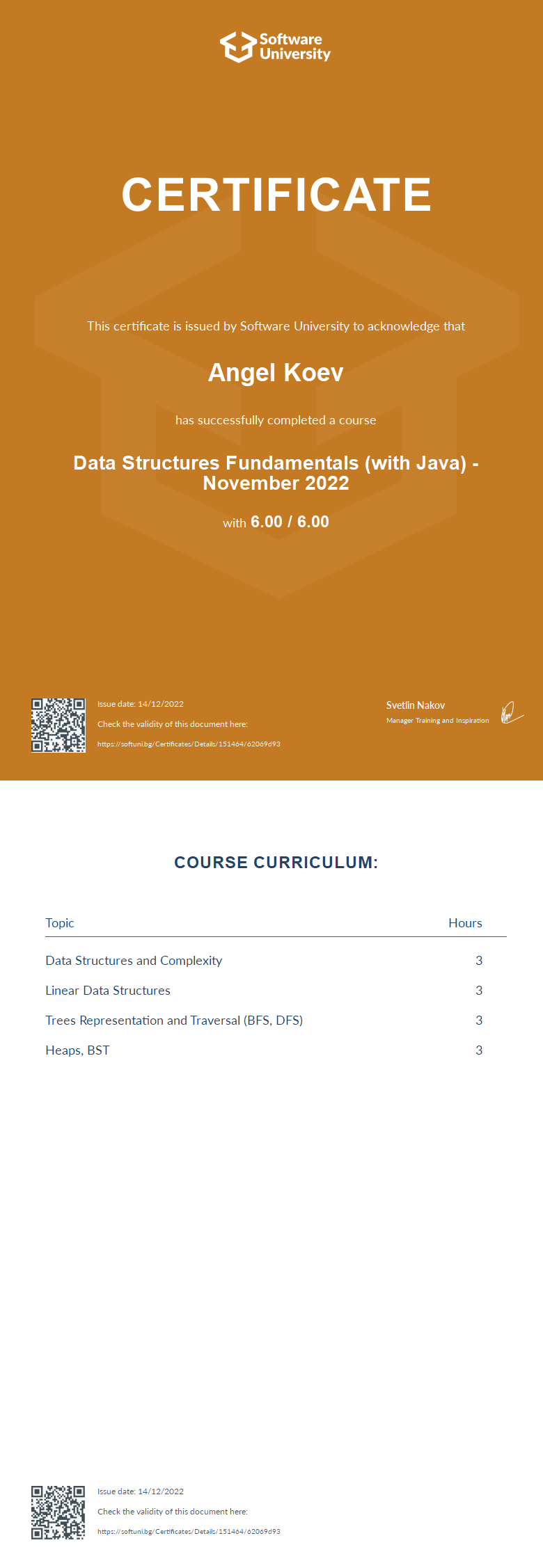 This certificate is issued by Software University to acknowledge that