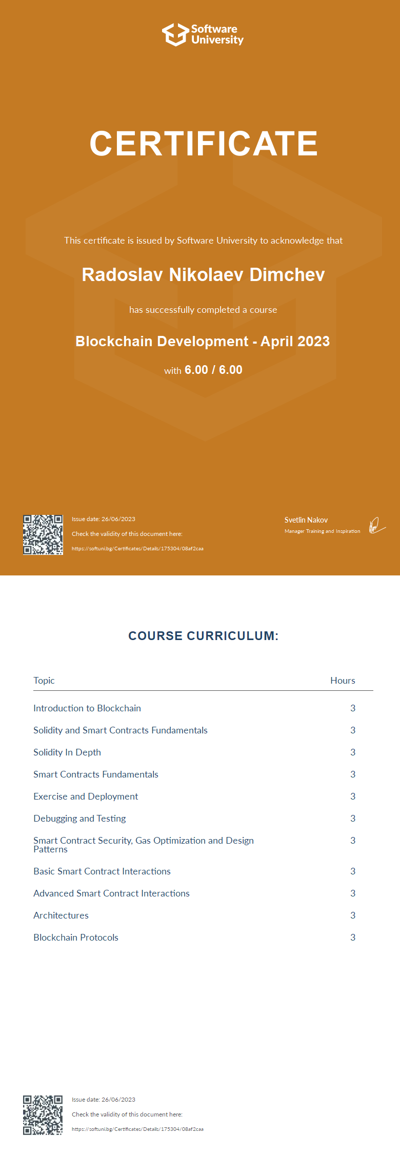 This certificate is issued by Software University to acknowledge that