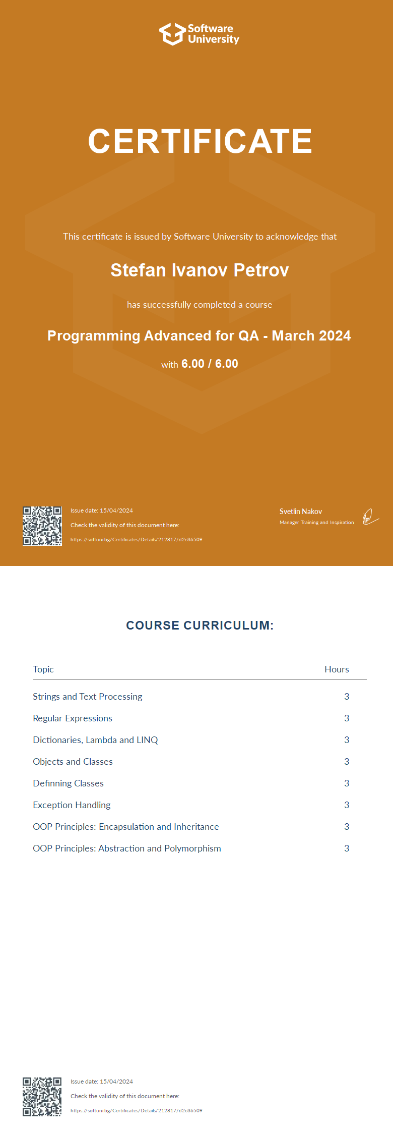 This certificate is issued by Software University to acknowledge that
