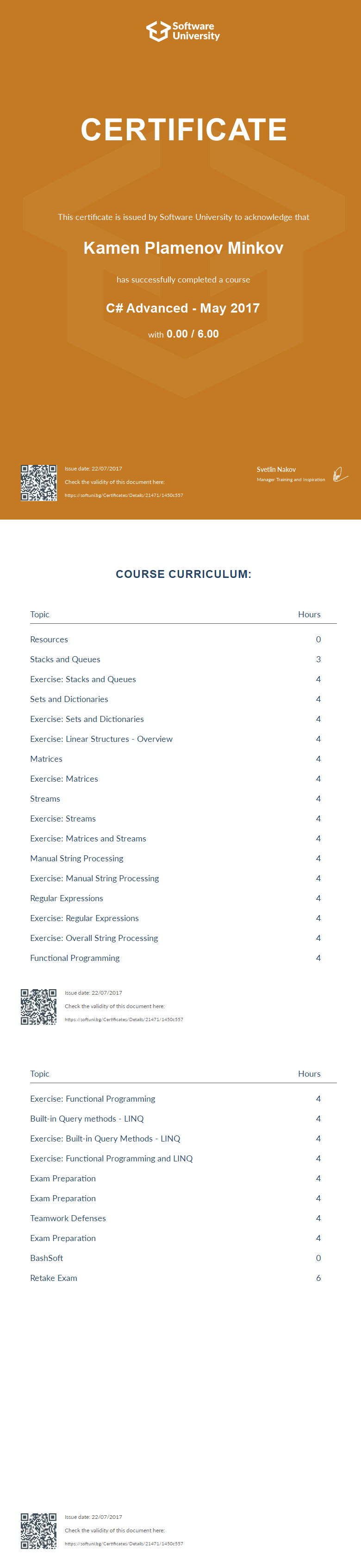 This certificate is issued by Software University to acknowledge that