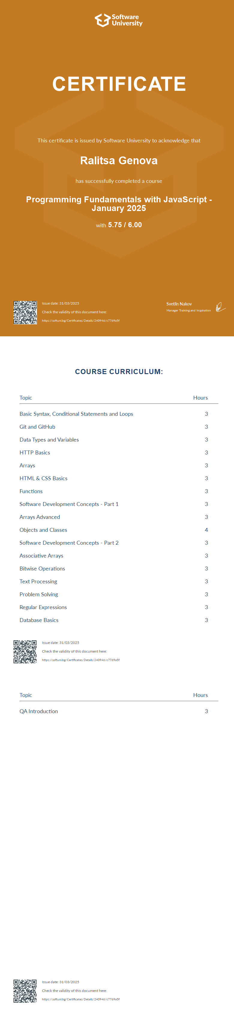 This certificate is issued by Software University to acknowledge that