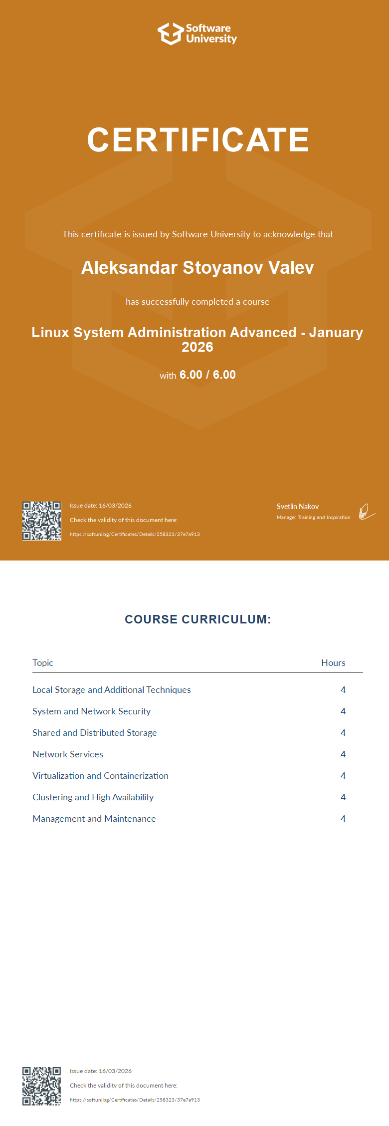 This certificate is issued by Software University to acknowledge that