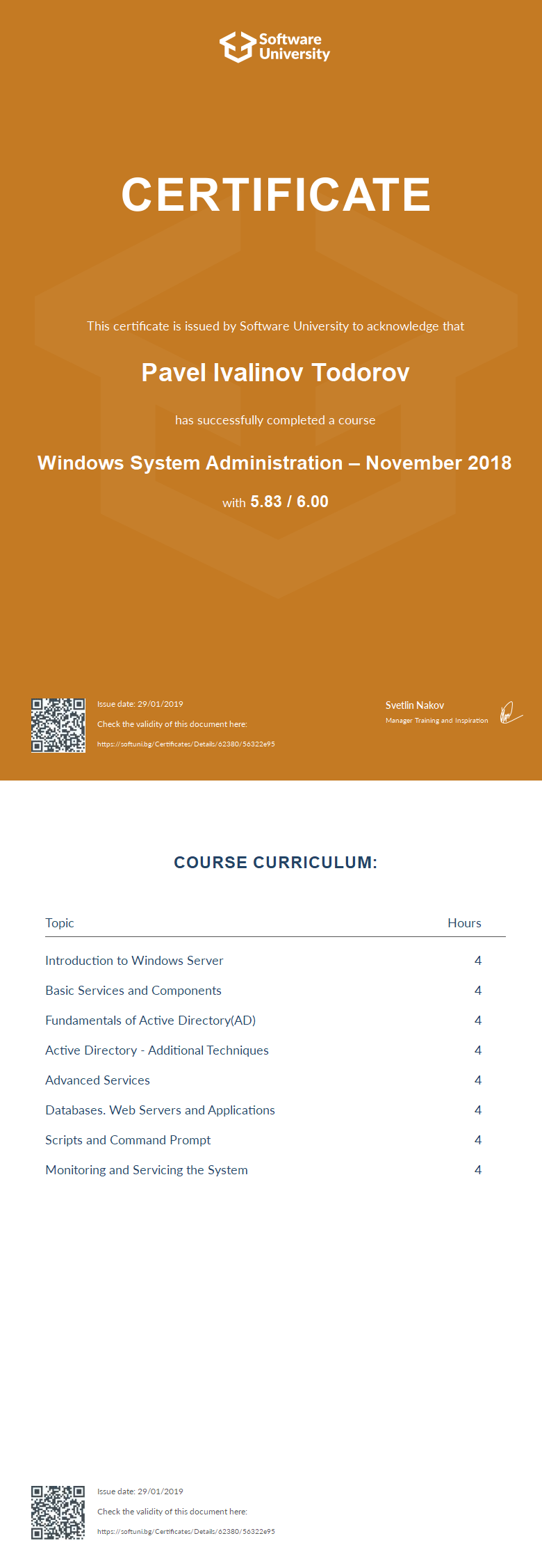 This certificate is issued by Software University to acknowledge that