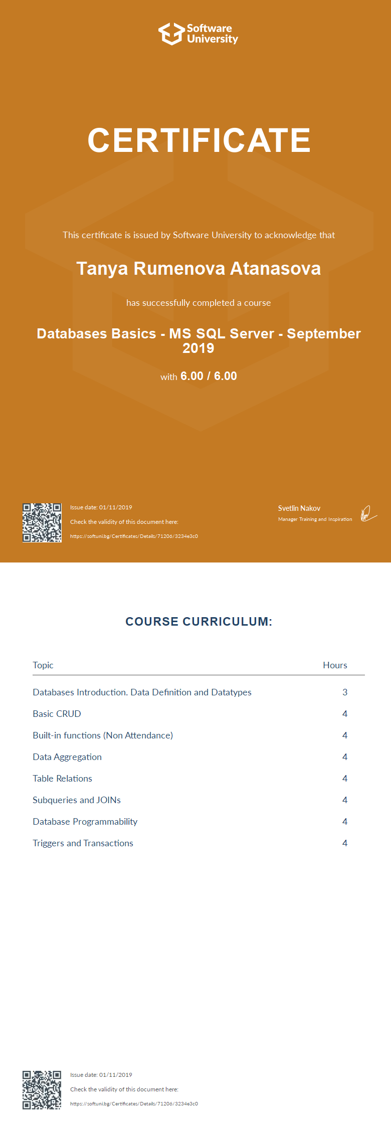 This certificate is issued by Software University to acknowledge that