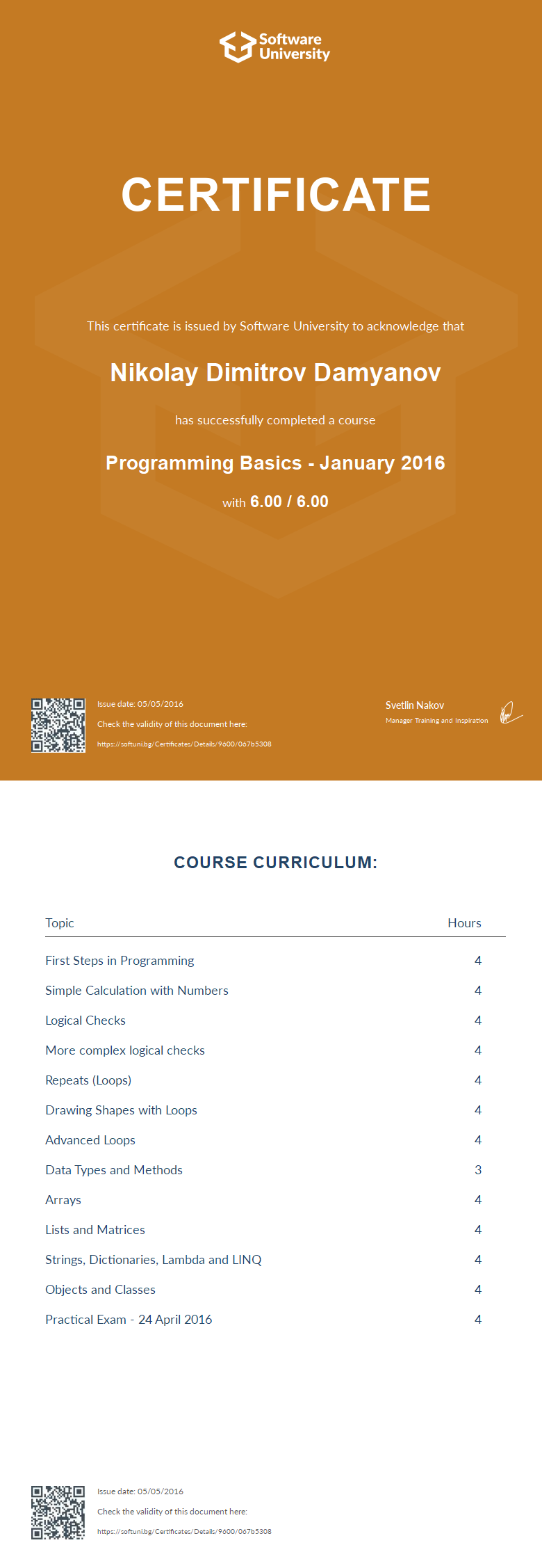 This certificate is issued by Software University to acknowledge that