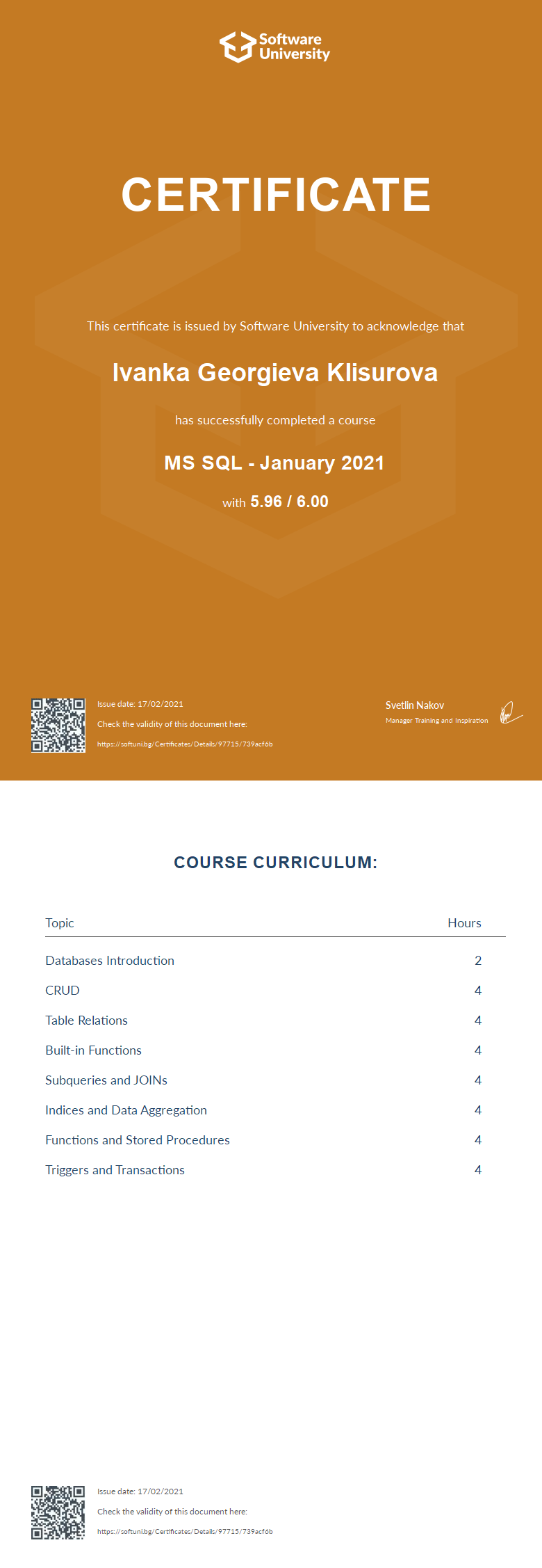 This certificate is issued by Software University to acknowledge that