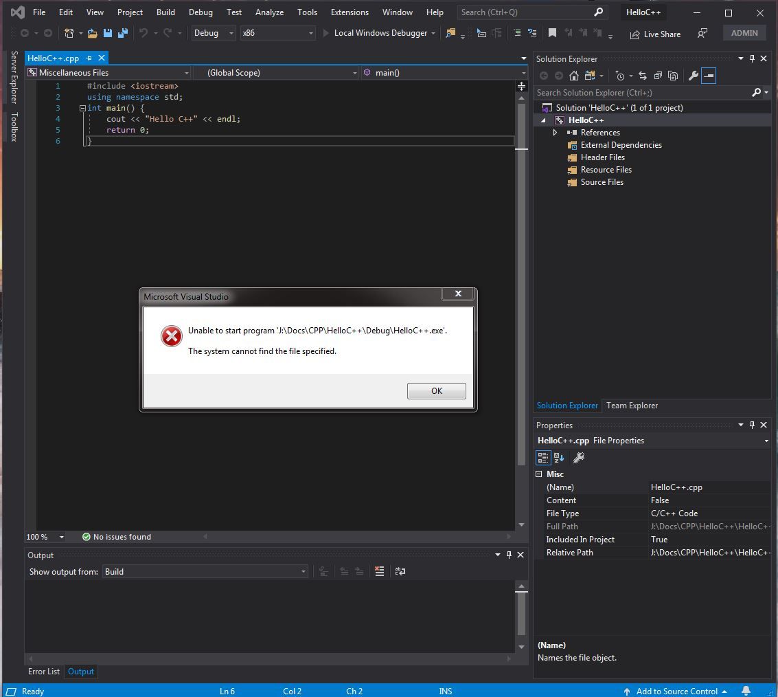 Въведах кода на HelloC++ и опитах да я пусна (първо с Ctrl+F5, а след това пробвах с бутона във VS) - и в двата случая получих съобщение за грешка (конзолата не се отваря, прозореца й само премигва за част от секундата).